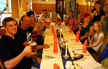 | Um 17:30 Uhr können wir endlich auf die schöne Wanderung anstoßen -nach erfolgter Auswertung unserer Punktekarten - alle hatten mehr als 10 Punkte erreicht und durften somit auch etwas essen ;-) Das Buffet war super! Vielen Dank an Organisator Maik und das Team vom Waldhaus !!! |