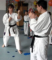 Der Samstag steht zum größten Teil im Zeichen des Kumite. Während Akay Özdemir Techniken demonstriert, um die Distanz im Angriff schnell zu überwinden und mit Faust- und Fußtechniken sauber zu punkten, führt Kasim Keles diesen Gedanken weiter und das Überlaufen des Gegners mit anschließendem Fegen wird ausführlich demonstriert und geübt. |