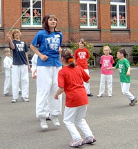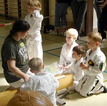![]() Amy, Gina, Tim, Leonie, Vivien, Tobias, Robin und Marcel stellen in Eigenregie einige Grundtechniken des Karate vor. |