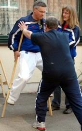 | Kasim Keles ist auch Träger des 7.Dan im Jiu Jitsu. Bei ihm werden in der Selbstverteidigungseinheit speziell Handhebeltechniken trainiert, die dann am Sonntag mit Übungen zur Befreiung aus verschiedenen Würgegriffen fortgeführt werden. |
