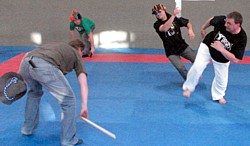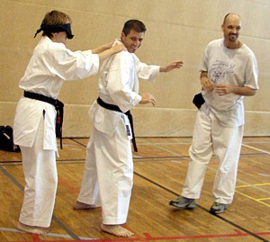 ![]() Thomas, Mandy, Janet, Karin und Tibor verblüffen mit einer eigenwilligen Zusammenstellung zweier verschiedener Kata und beweisen, dass selbst Anfänger in der Sportart Karate mit ihrem Wissen siegreich hervorgehen können. |