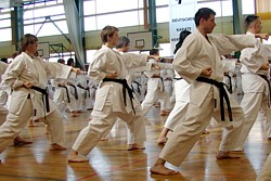 ![]() Nach einer turbulenten Nacht, einer Brötchenschlacht am Frühstücksbuffet und der obligatorischen Aufräumaktion der Klassenzimmer treffen sich alle Karateka auf dem Schulhof zum gemeinsamen Abschlusstraining. |