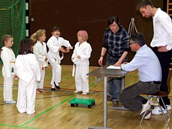 | Die kleinsten Karateka messen sich im Leistungstest und die ganz Mutigen zeigen ihre erste Kata. Aufgeregt und manchmal mit Tränen begleitet fiebern sie auf der großen Kampffläche ihrem Start entgegen, den die für diese Altersstufe extra geschulten Kampfrichter bewerten. |