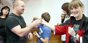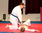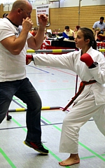 | Den Höhepunkt der Veranstaltung bildete die Vorführung der mit den Familienangehörigen einstudierten Selbstverteidigungstechniken. Hier wurde neben dem fundierten Technikwissen auch sehr viel schauspielerisches Talent in die Darbietung gelegt und so war es für alle Anwesenden eine Freude zuzuschauen. |