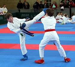 | Bastian und Jan setzten sich in ihrer Gewichtsklasse souverän bis in das Finale durch, dass Bastian mit unbeugsamem Kampfwillen dann für sich entscheiden konnte. Ebenso Felix, der leider im Kampf um Platz 1 knapp unterlag. Josias und Anthony stellten sich der großen Konkurrenz in ihrer Gewichtsklasse und konnten sich beide durch die Trostrunde auf den 3.Platz durchsetzen. Hier fiel ein Kampf von Josias besonders auf, den er vorzeitig durch 8:0 für sich entscheiden konnte. Laura vergab im Kampf um den Einzug ins große Finale leider entscheidende Punkte und ihre lange gehaltene 6:1 Führung ging durch 2 Fußtritte ihrer Gegnerin in letzter Minute verloren. Den dritten Platz konnte ihr aber niemand mehr streitig machen. Wie zu erwarten erreichte auch Mateusz das Finale, doch hier machte sich die Konditionseinbuße der vorhergehenden Runden bemerkbar und er musste sich mit dem Vizemeistertitel zufrieden geben. |