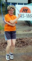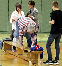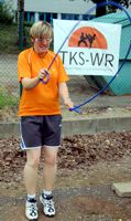 | Im Koordinationsbereich gibt es auch noch die schöne Disziplin "Seilspringen", die sehr zur Freude aller Zuschauer erst einmal ausprobiert werden musste - gar nicht so einfach rückwärts oder mit Kreuzdurchschlag zu springen, aber dann kam der Profi und zeigte, wie es richtig geht.. |