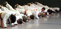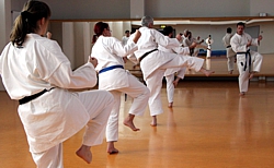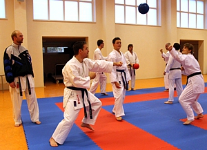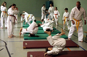 | Wir paukten nun unermüdlich "Sportartspezifisches Spezialwissen" und tummelten uns tagelang in der Turnhalle, um bei den verschiedenen Trainern des Landesverbandes alles Mögliche zu erfahren. Natürlich tobten wir uns nun bei Kata, Soundkarate, Kumite, Selbstverteidigung, Kihon, Wettkampf-Kampfrichterei und auch beim Jukuren-Training in der Schwimmhalle so richtig aus und viele neue tolle Ideen konnten dabei verinnerlicht werden. | ||