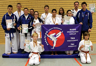 Landesmeisterschaft in Magdeburg Schneetreiben und Straßenchaos konnten uns nicht aufhalten, bei der Landesmeisterschaft in Magdeburg kräftig abzuräumen. Über 200 Starts konnte der Karateverband Sachsen-Anhalt bei diesem hochkarätigen Turnier verzeichnen und dass insgesamt 8 Platzierungen durch uns nach Wernigerode gehen, kann sich durchaus sehen lassen. Hauptsächlich im Kumite trumpften Bastian, Jan, Felix, Josias und Anthony bei den Kindern, Laura in der Altersklasse Schüler und Mateusz bei den Erwachsenen auf. |